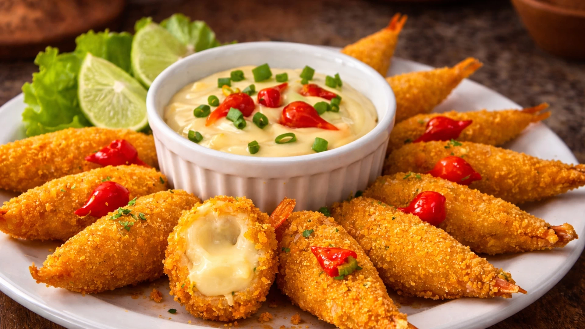 Camarões selecionados, empanados até ficarem super crocantes por fora e suculentos por dentro**, servidos com um **creme de Catupiry bem cremoso e temperado, que combina perfeitamente com o sabor do mar.