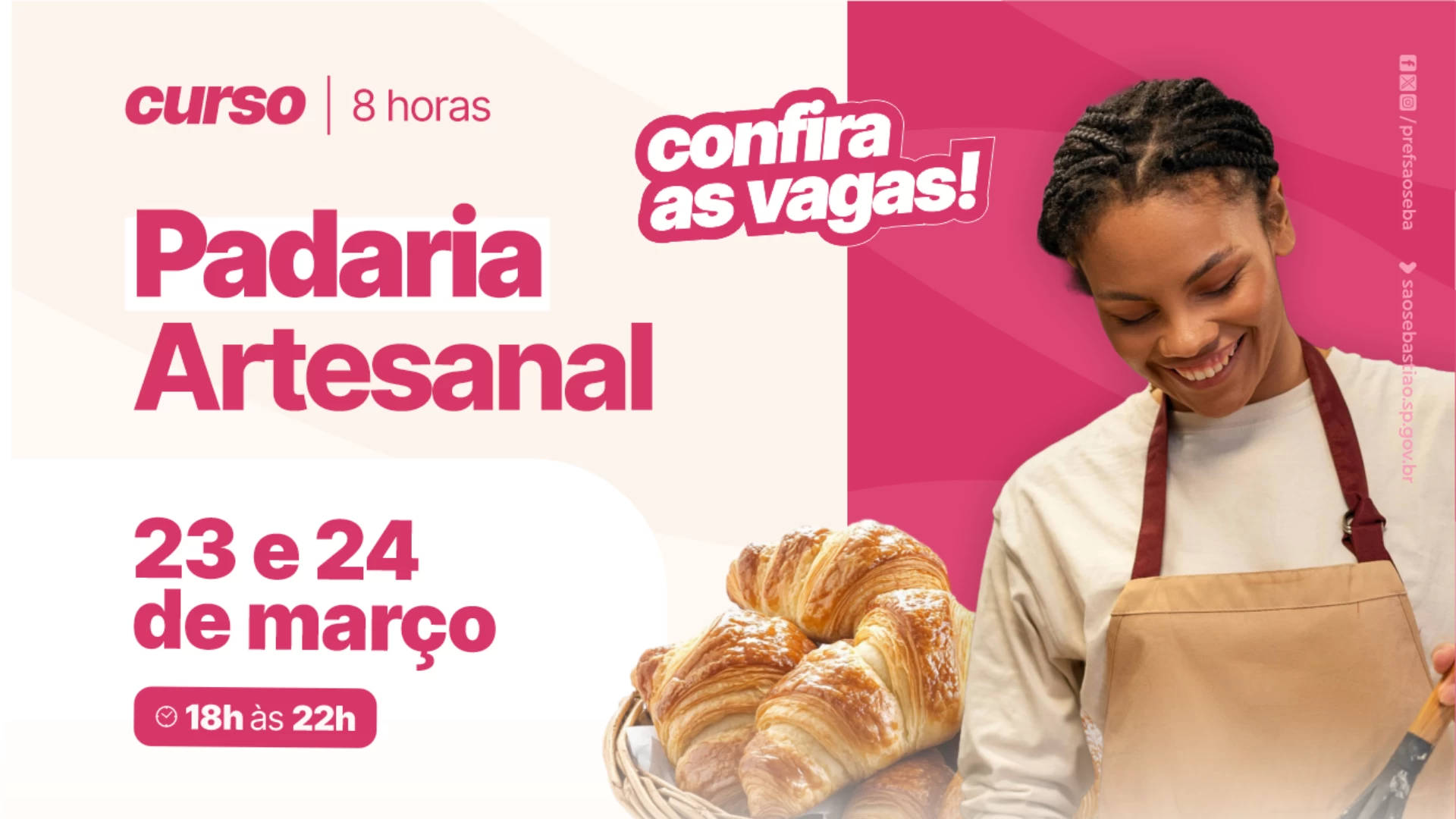 A Prefeitura de São Sebastião, em parceria com o Fundo Social, promove o 1º Curso de Padaria Artesanal, que será realizado nos dias 23 e 24 de março, das 18h às 22h, no Centro Integrado Profissionalizante (CIP), no bairro Topolândia.