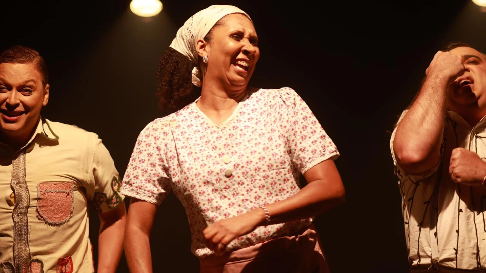 #PraTodosVerem: Cena teatral em palco escuro com iluminação quente destacando três atores em diferentes momentos da apresentação. Dois deles usam figurinos femininos coloridos, com vestidos e aventais, enquanto uma atriz veste blusa florida, saia rosa e lenço branco na cabeça. Em um momento, os dois atores à esquerda demonstram emoção ao cantar ou falar, enquanto a atriz sentada à direita observa; em outro, os três aparecem mais próximos, sorrindo e interagindo de forma cômica; e em seguida estão alinhados no centro do palco, segurando pequenos cadernos, com expressão mais séria, como se lessem ou cantassem juntos. O cenário é simples, com cadeiras, uma pequena mesa, livros empilhados, uma boneca e uma mala, reforçando o ambiente minimalista da encenação. Fim da descrição.