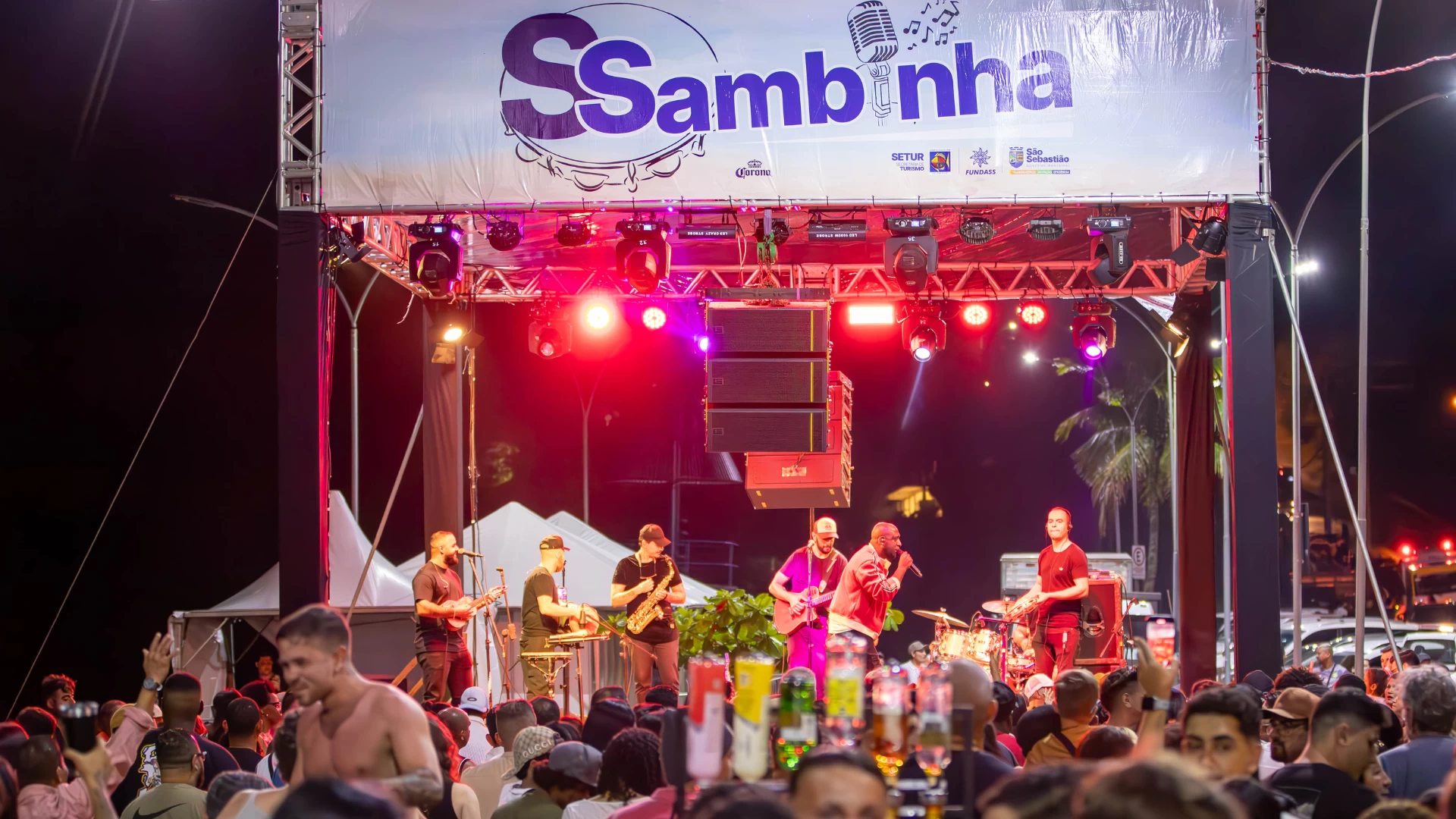 #PraTodosVerem: Imagens de um evento noturno à beira-mar com palco montado para o SSambinha, na Praça Pôr do Sol. Banda se apresenta sob luzes coloridas enquanto uma grande multidão ocupa a orla, com pessoas assistindo, dançando e circulando entre barracas e estruturas ao longo da avenida iluminada. Fim da descrição.