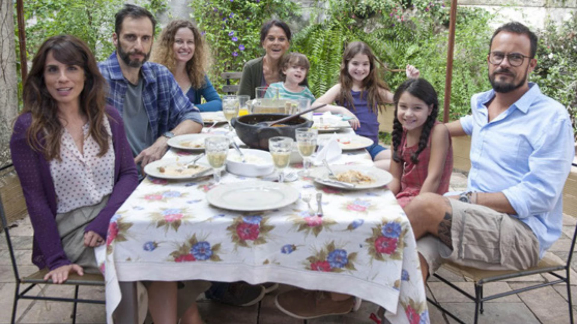 #PraTodosVerem: A primeira imagem mostra o rosto apreensivo de uma mulher de cabelos cacheados; na segunda, uma jovem observa com desconfiança uma mulher mais velha que segura uma mangueira; a terceira apresenta uma família numerosa reunida ao redor de uma mesa de almoço em um jardim; e a quarta destaca uma jovem com visual retrô, usando vestido azul, luvas brancas e penteado clássico sobre um fundo escuro. Fim da descrição.