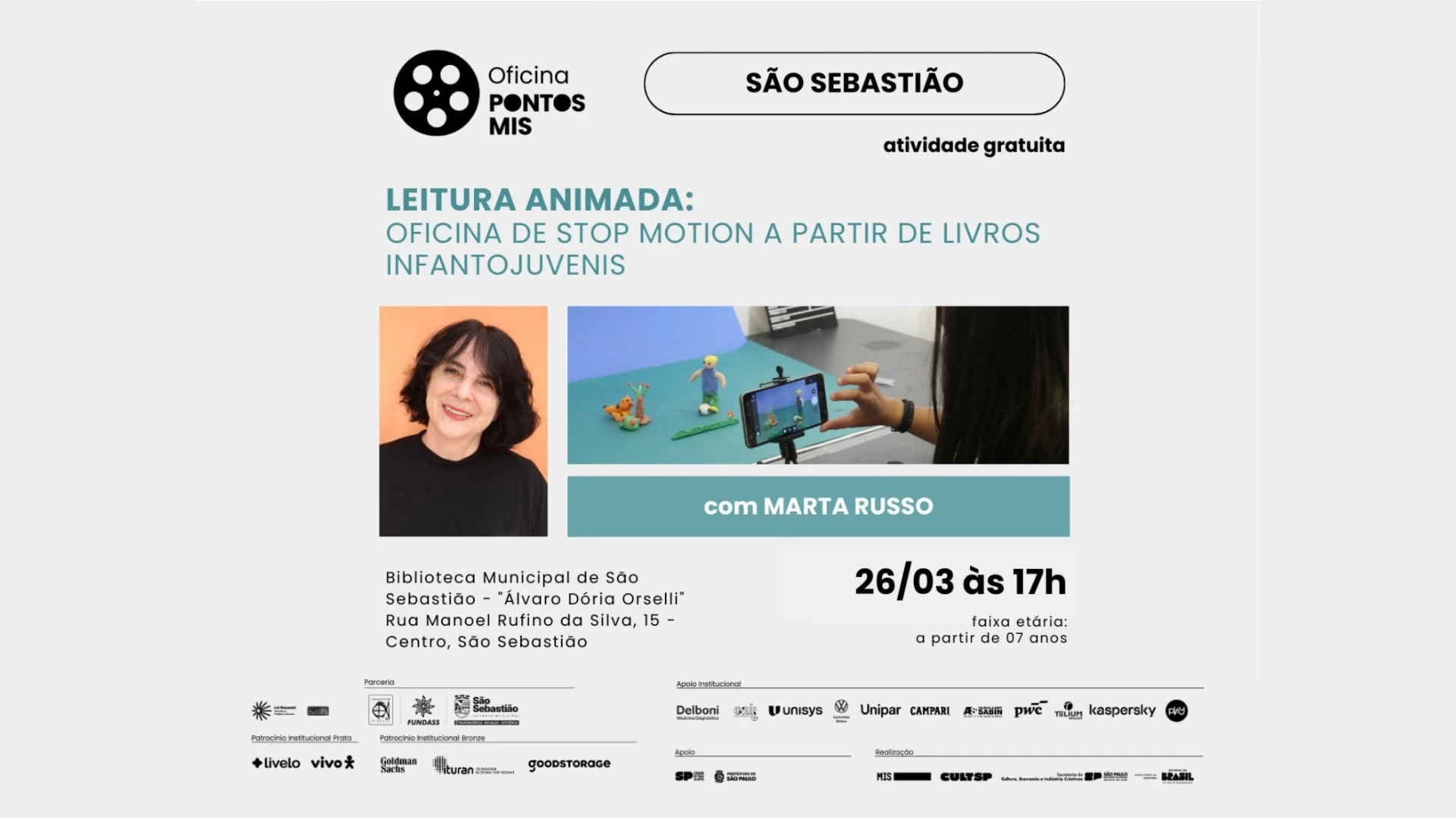 #PraTodosVerem: Card de divulgação da oficina "Leitura Animada: Oficina de Stop Motion a partir de livros infantojuvenis", com Marta Russo. No topo, os logos "Oficina Pontos MIS" e "São Sebastião". Ao centro, uma foto da ministrante sorridente e outra imagem mostrando a produção de uma animação com bonecos de massinha e um celular. Abaixo, as informações: dia 26/03 às 17h, na Biblioteca Municipal Álvaro Dória Orselli, para maiores de 7 anos. O rodapé contém diversos logotipos de parceiros e realizadores. Fim da descrição.