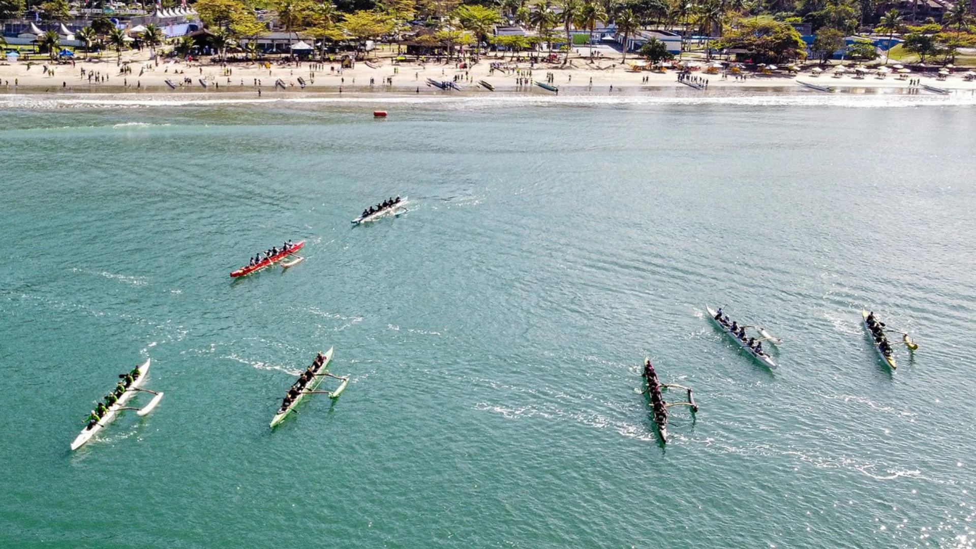 #PraTodosVerem: Registro aéreo e lateral de canoas havaianas no mar, no Campeonato Brasileiro de Va’a, em São Sebastião, realizado em 2022, com várias equipes remando em embarcações coloridas próximas à faixa de areia. As imagens mostram os atletas alinhados sobre a água azul-esverdeada, disputando a prova em diferentes trechos do percurso, enquanto a praia ao fundo reúne público, tendas, coqueiros e canoas estacionadas na beira do mar. Fim da descrição.
