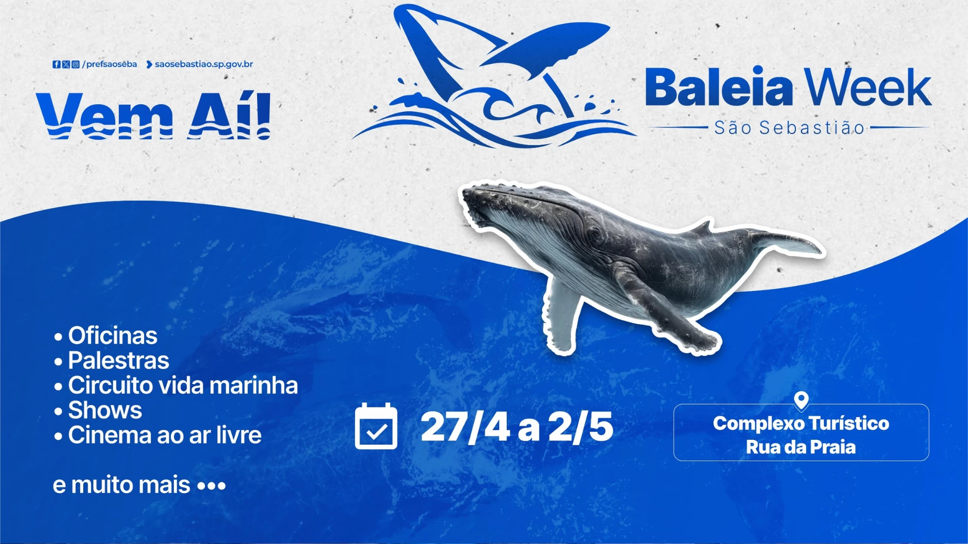 A Prefeitura de São Sebastião, por meio da Secretaria de Turismo (Setur), promove, entre os dias 27 de abril e 2 de maio, a primeira edição do Baleia Week, evento voltado à educação ambiental e à valorização da relação entre a comunidade e o ambiente marinho.